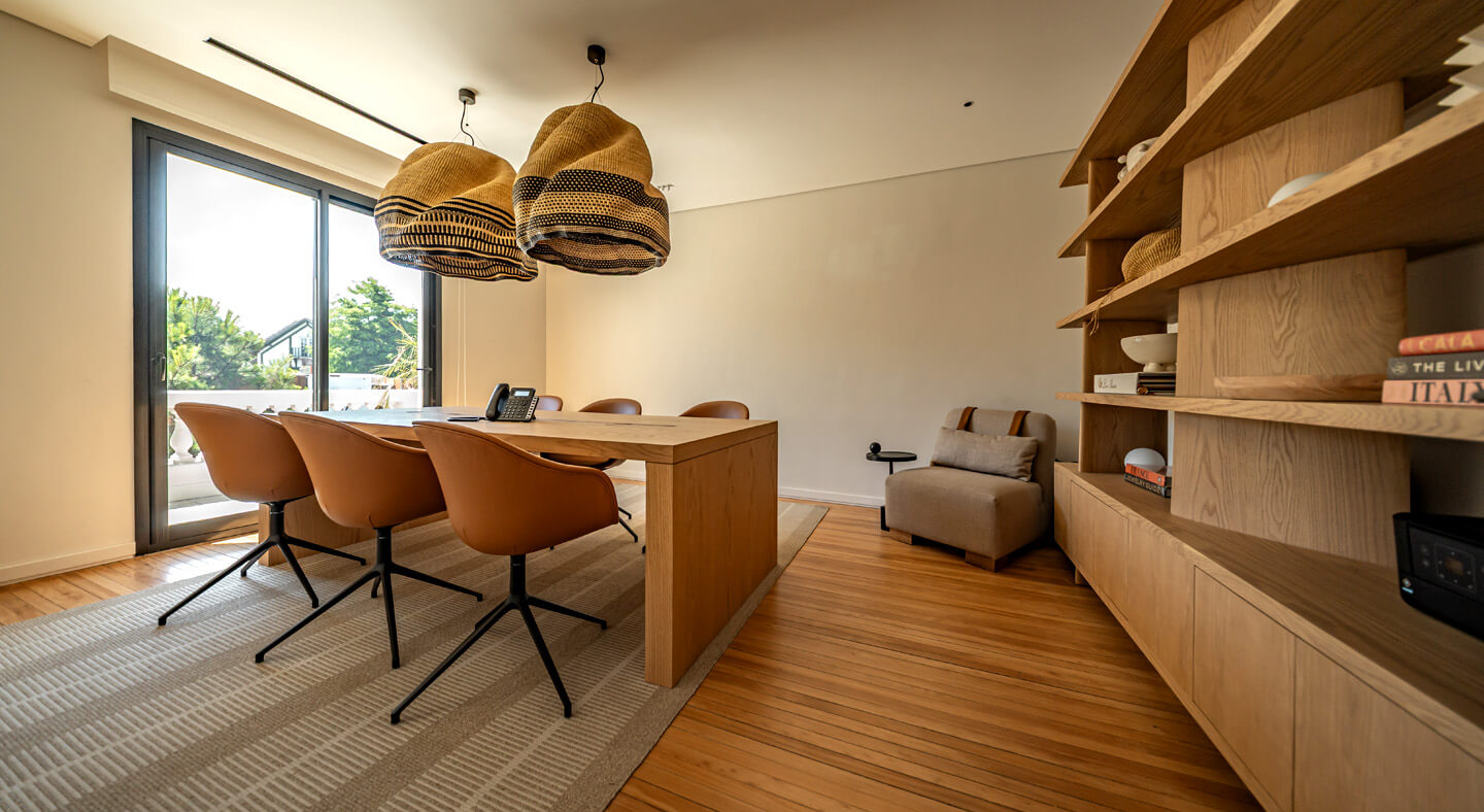 Diseñado para encuentros estratégicos, sesiones creativas o cierres de negocios, el Studio combina funcionalidad y belleza en equilibrio perfecto. La luz natural inunda cada rincón, la madera respira calidez, y la mesa central —corazón del espacio— invita a la conversación, la creación y la colaboración.